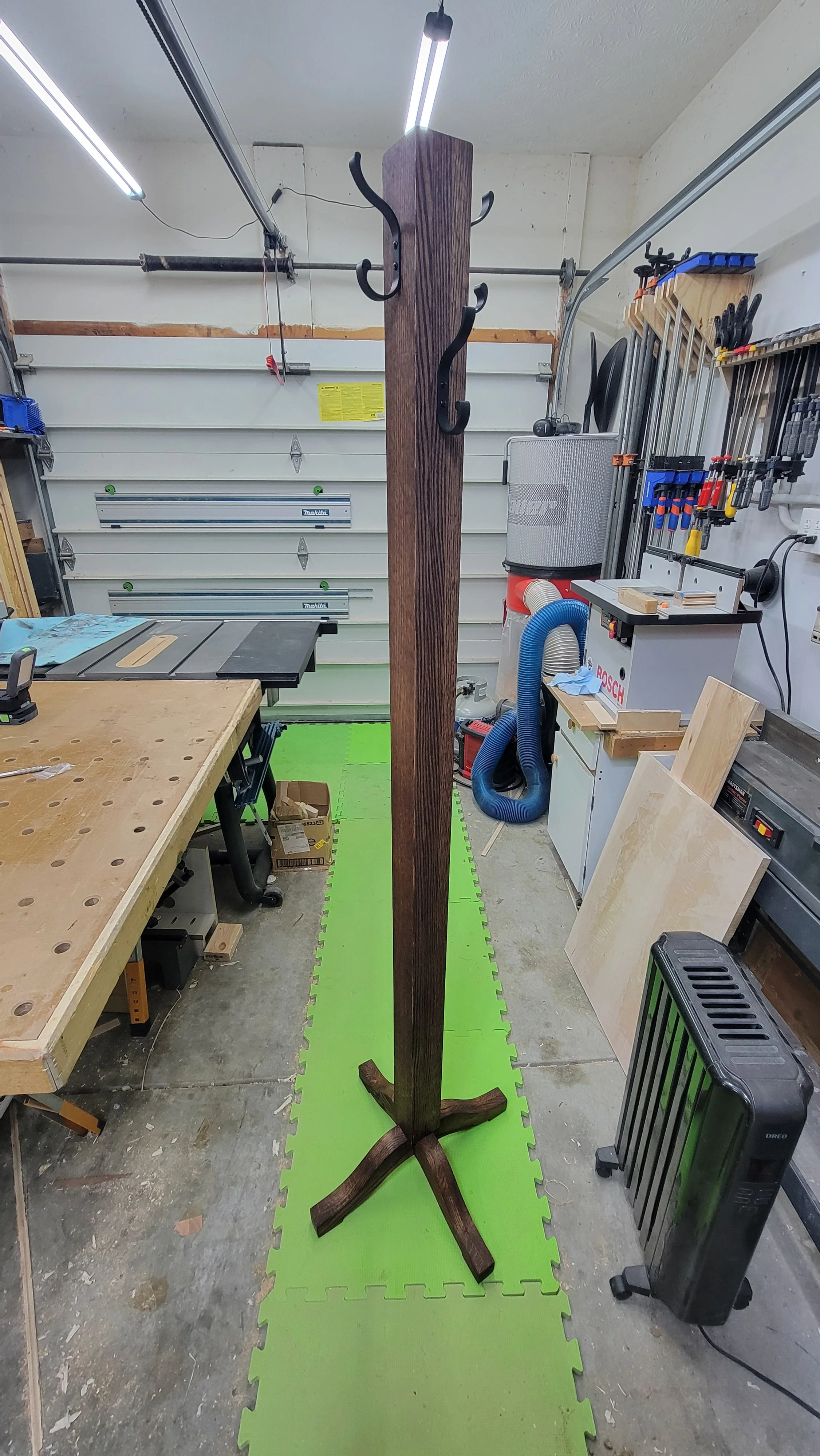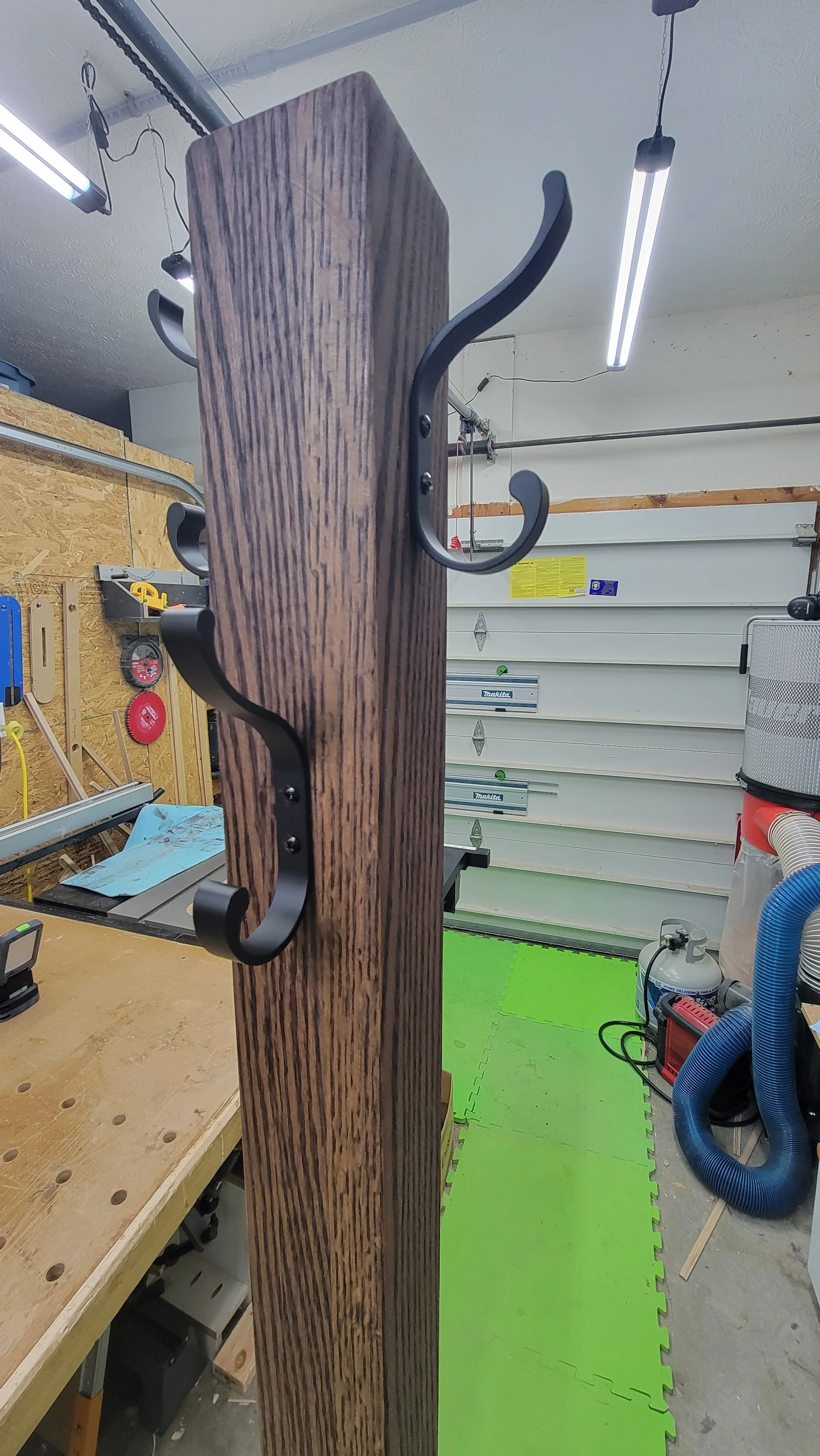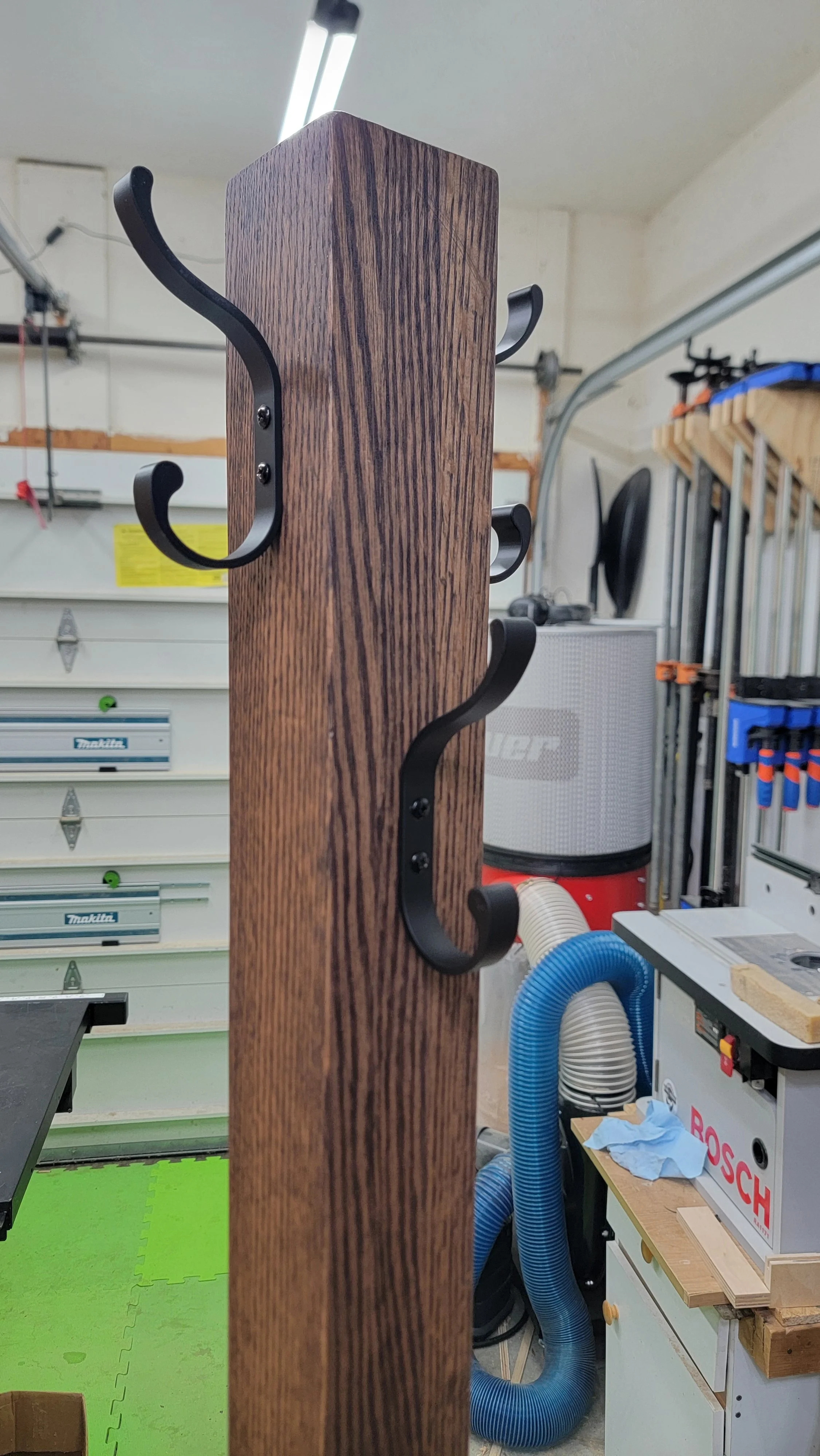 A customer had a family heirloom coat rack that broke. All she had left was the base. A new tree was made using red oak and finished with Rubio Monocoat in a Chocolate color and was attached to the original base. A simple coat rack tree that will last a lifetime.